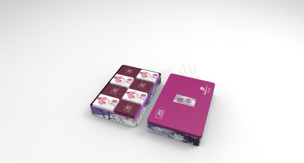 福餅鐵盒:整個包裝以書法字體為主,“福餅”兩個字貫穿整個包裝,搭配上深紫色調(diào),簡單直接的表現(xiàn)出產(chǎn)品的特色,同時月餅的包裝因為有兩種風(fēng)味的產(chǎn)品,所以內(nèi)盒采用了不同顏色搭配不同風(fēng)味的方法,直觀的展現(xiàn)出口味的特色。
